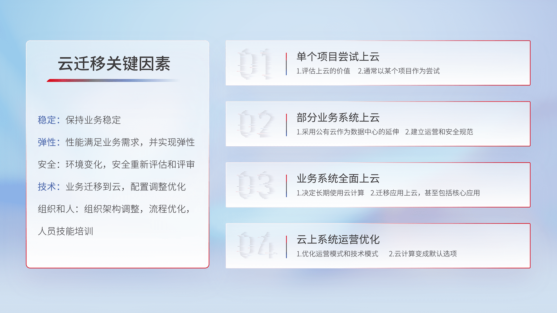 结合实际业务,,,,从规划设计、、、云平台选型、、、、云原生改造、、、、数据迁移、、集成交付,,迁移全过程为客户识别最佳上云路径,,,做好风险识别管理,,,设计网络架构、、、身份权限、、、、安全审计合规、、、、操作审计、、日志审计、、、、监控告警策略、、、多站点容灾设计等,,对云上基础设施进行整体规划,,提升IT治理水平,,,以满足弹性、、、、高可用、、、、高性能的需求。。